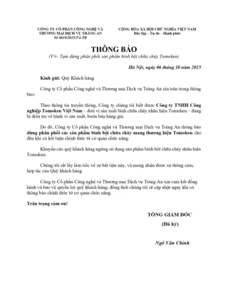 Do đó, Công ty Cổ phần Công nghệ và Thương mại Dịch vụ Tràng An thông báo dừng phân phối các sản phẩm bình bột chữa cháy mang thương hiệu Tomoken cho đến khi có kết luận chính thức từ cơ quan chức năng.